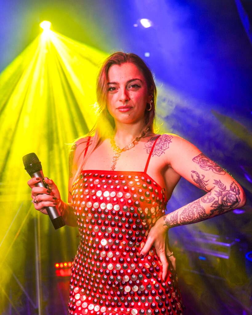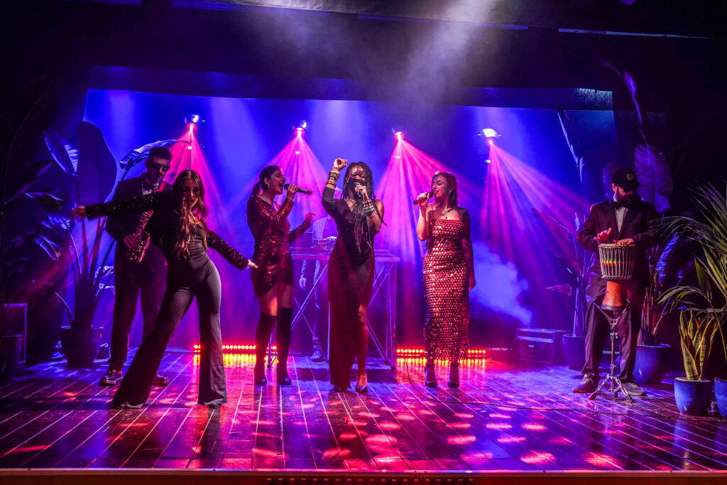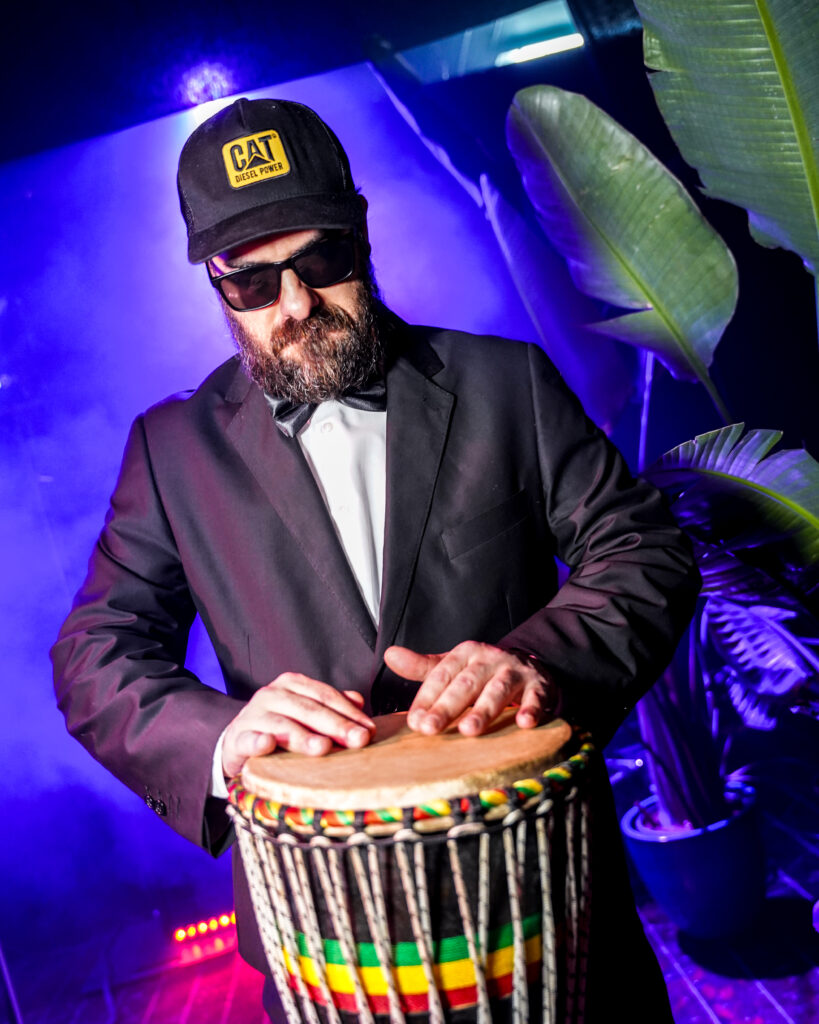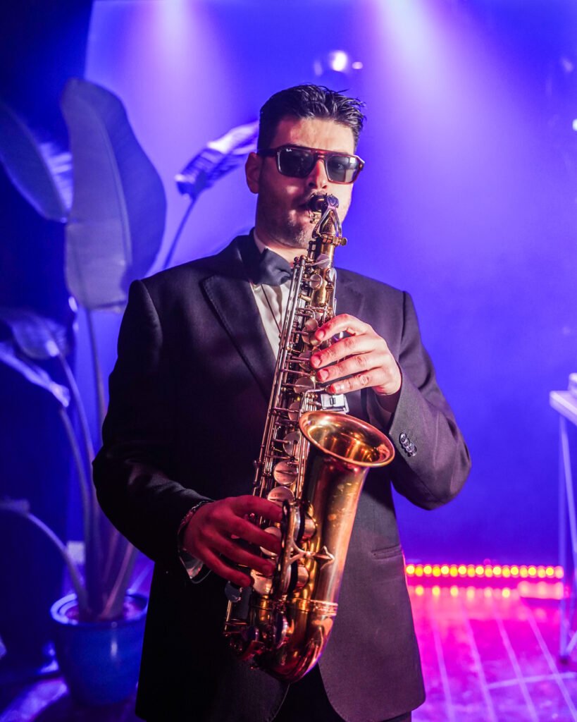 Il DJ costruisce il ritmo della serata. Inoltre, le voci guidano il pubblico con energia e presenza. Allo stesso tempo, il sax dialoga con la console creando dinamica e intensità. Le percussioni rafforzano il groove, mentre la componente coreografica aggiunge movimento e impatto visivo.